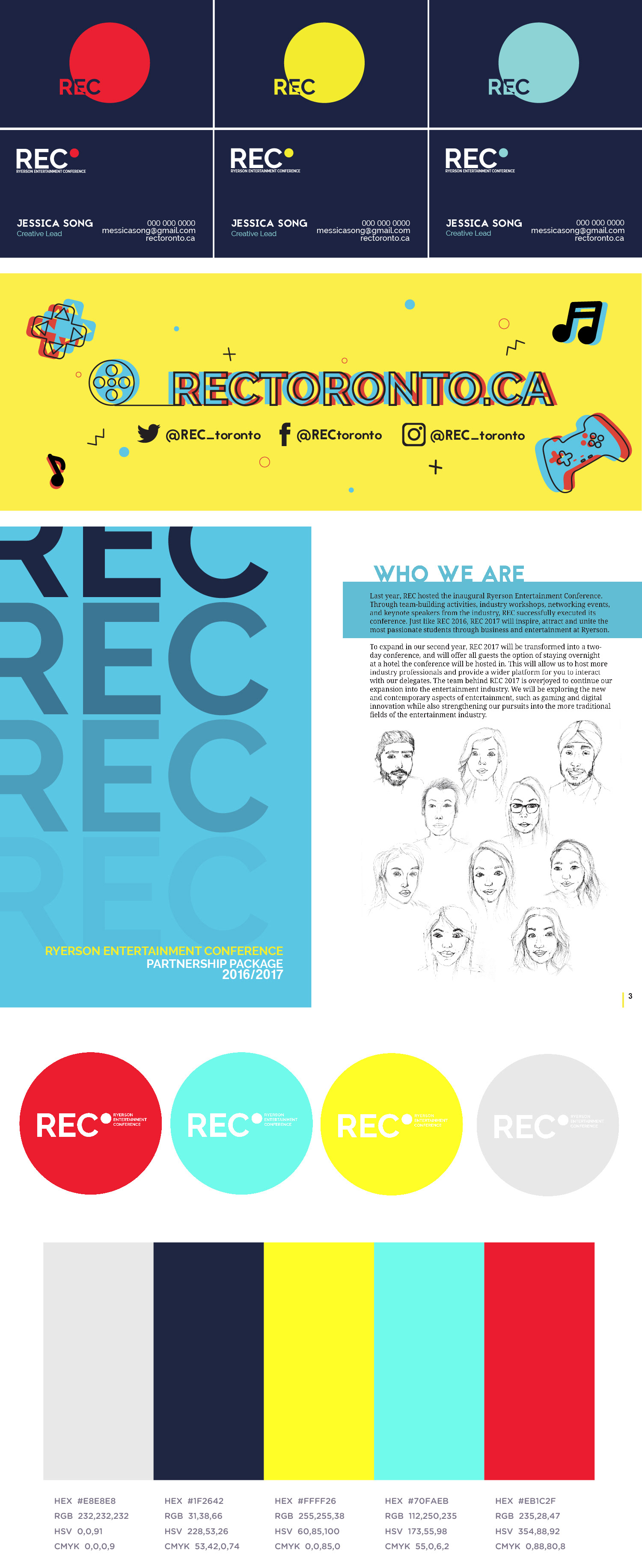 Ryerson Entertainment Conference Rebranding. Business cards, social media headers, partnership packages, stickers, and pallet.
